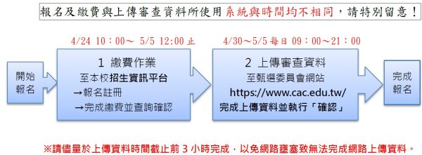 (二)簡章校系分則「審查資料」欄所列項目,除學系有特殊規定者,一律以網路上傳方式傳送至大學甄選委員會(網址:https://www.cac.edu.tw/),點選資料審查「確認」作業。